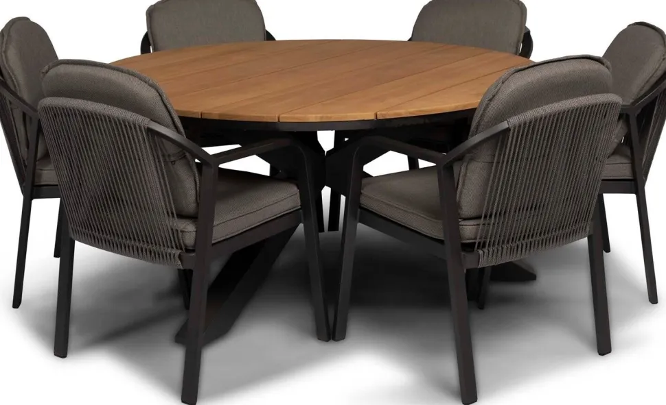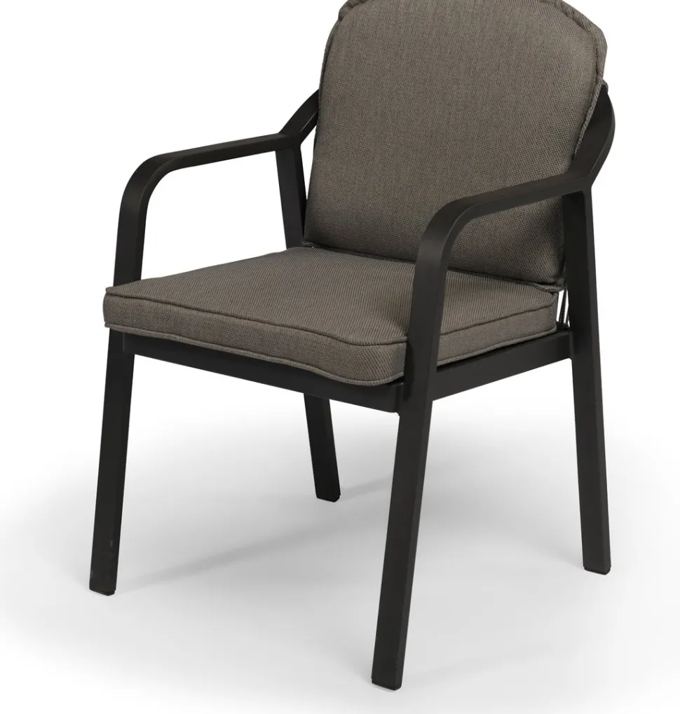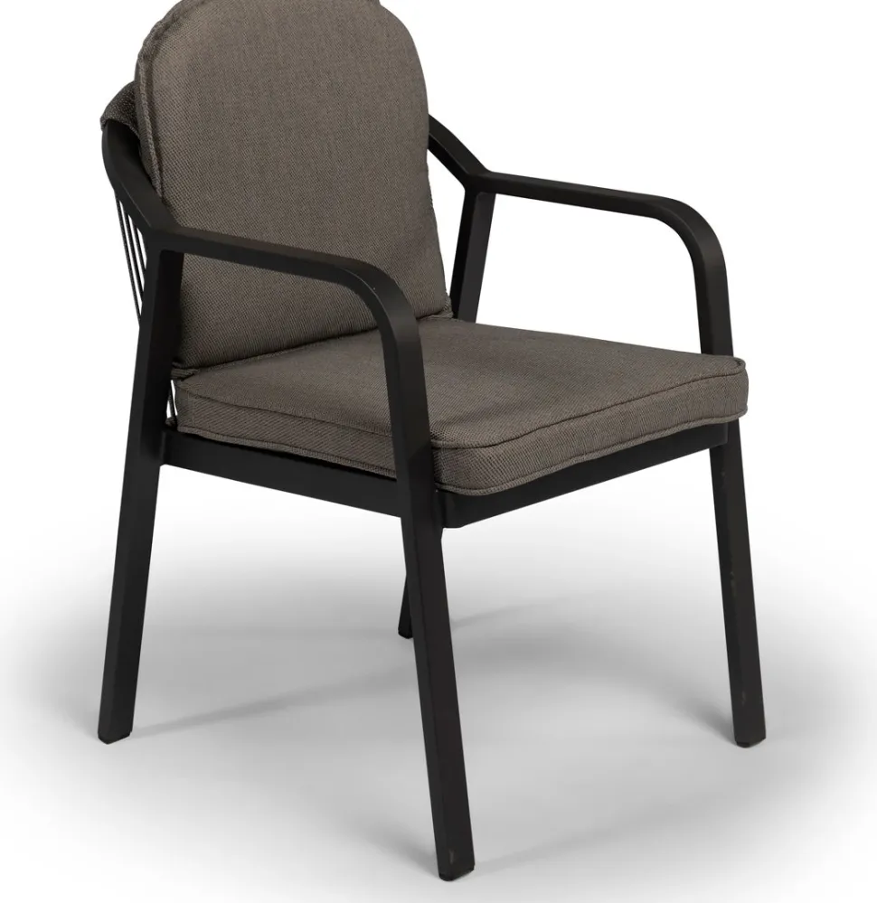 Der Gartenstuhl ‚Pep‘ der Marke Tierra Outdoor ist mit seinem modernen und zeitlosen Design ein echter Zugewinn für deine Terrasse. Die abgerundeten Ecken verleihen dem Gartenstuhl ‚Pep‘ einen spielerischen Twist. Der Dining-Gartenstuhl besteht aus einem beschichteten Aluminium-Gestell in der Farbe Charcoal (anthrazit) und einer mit Olefin-Seil bespannten Sitzfläche, die diesen Stuhl zu einem wahrne Hingucker macht. Dieses Seil ist speziell für den Einsatz im Freien entwickelt und wird aus besonders strapazierfähigen synthetischen Fasern gefertigt. So ist die Seilbespannung nicht nur äußerst robust und komfortabel, sondern sieht auch nur sehr dekorativ aus. Kein Wunder also, dass seilbespannte Gartenmöbel voll im Trend sind und derzeit die Gärten erobern! Die hochwertigen „Allwetter“-Kissen in der Farbe grau sind ebenfalls im Lieferumfang enthalten. Das Sitz- und Rückenkissen ist extra gepolstert und sorgt so für optimalen Sitzkomfort. Die Kissen können problemlos bei einem leichten Regenschauer draußen bleiben und erleichtern dir so das Leben!
