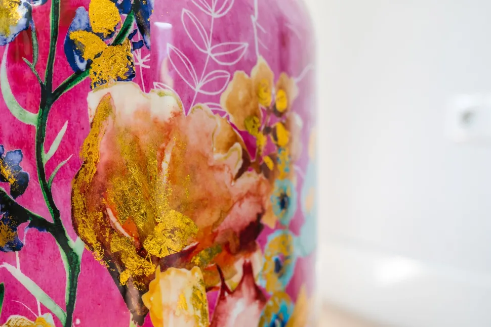 Die Grundlage für dieses Design ist Fuchsia, eine leuchtende Farbe, die uns Inspiration und Energie gibt. Lammie hat diesen leuchtenden rosa Farbton mit einem Festival der Blumen kombiniert. Temperamentvoll, intensiv und vor allem optimistisch. Sie ist eine Quelle für tägliche Glücksmomente.