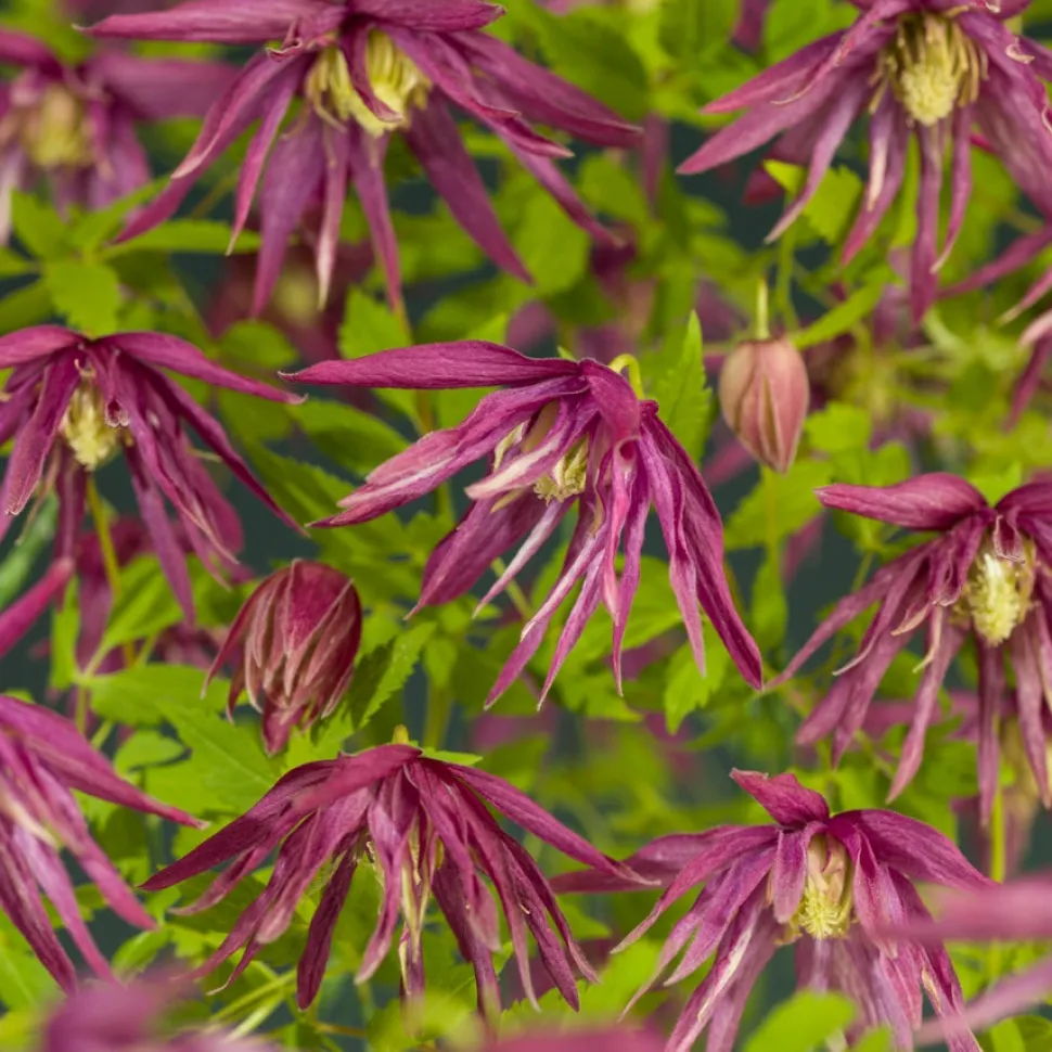 Diese Clematis blüht im Frühjahr und entwickelt violett-rote Blüten. Die Blütenblätter sind schmal, länglich und verleihen der Pflanze ihr unverwechselbares Aussehen.